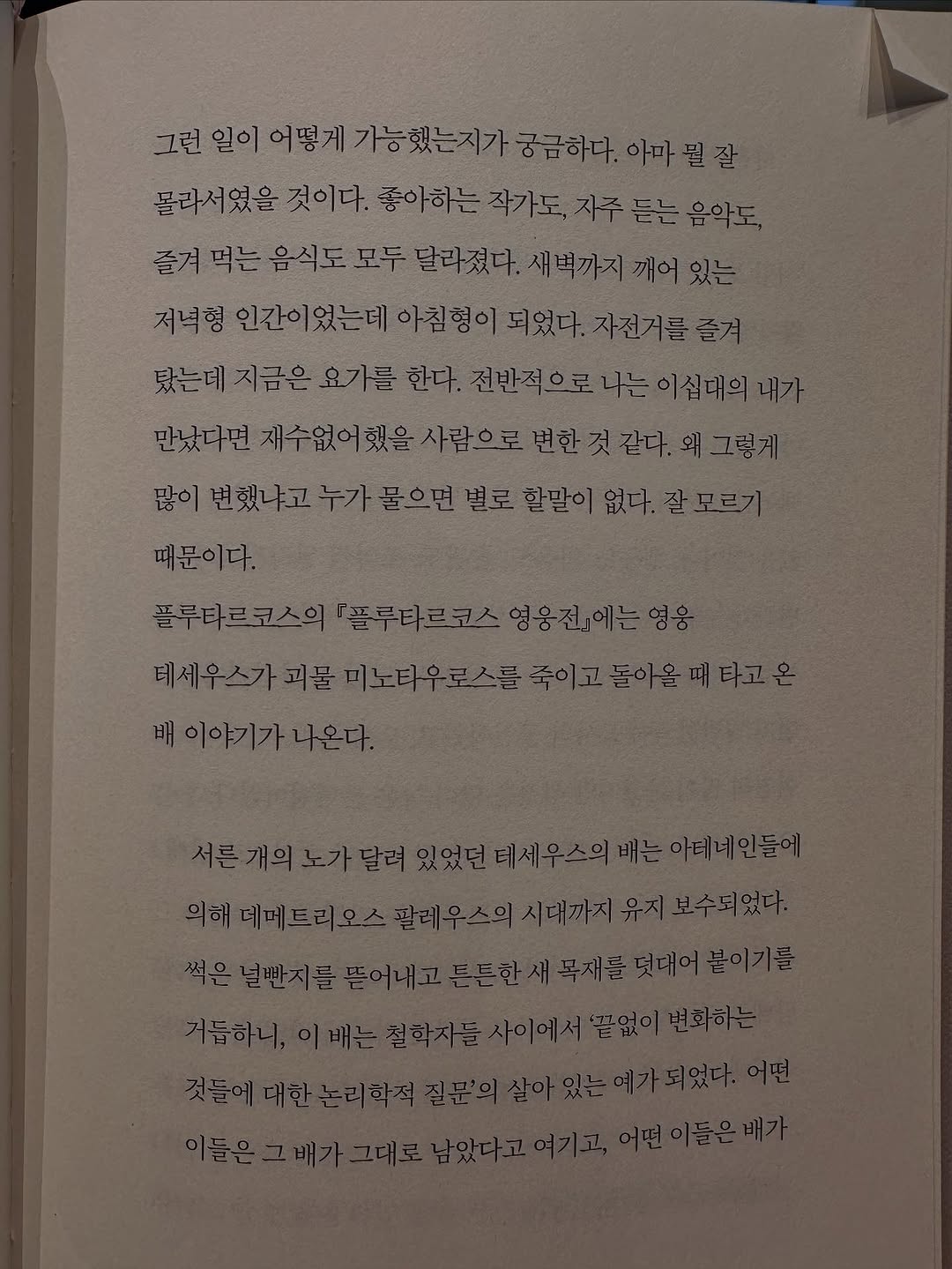‘사람은 변치 않는다’는 말을 자주 듣지만, 작가님은 ‘테세우스의 배’ 비유를 통해 사람이 끊임없이 변화하는 존재임을 역설해요. 노력으로든 환경 적응으로든, 우리는 계속 달라지고 있음을 인정하는 것. 그게 중요한 것 같아요.